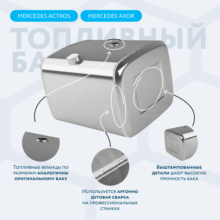 Алюминиевый бак не подвержен коррозии, что делает его более долговечным, а так же сбережет вашу топливную систему. Бак из алюминия в два раза легче стального бака, хотя он и изготовлен из листа увеличенной толщины в 2,5 мм. В конструкции предусмотрены цельные перегородки, которые проварены по периметру. Баки из алюминия так же оснащены заливной горловиной с самозапираемым непроливаемым клапаном (который становится барьером для разлива топлива, а так же становится защитой от попадания мусора в бак при открытой крышке) . Кроме того, однозначно что алюминиевый бак выглядит намного привлекательнее и дороже - где бак в том числе становиться и элементом тюнинга автомобиля. На алюминиеввые баки действует увеличенная гарантия - 36 месяцев.